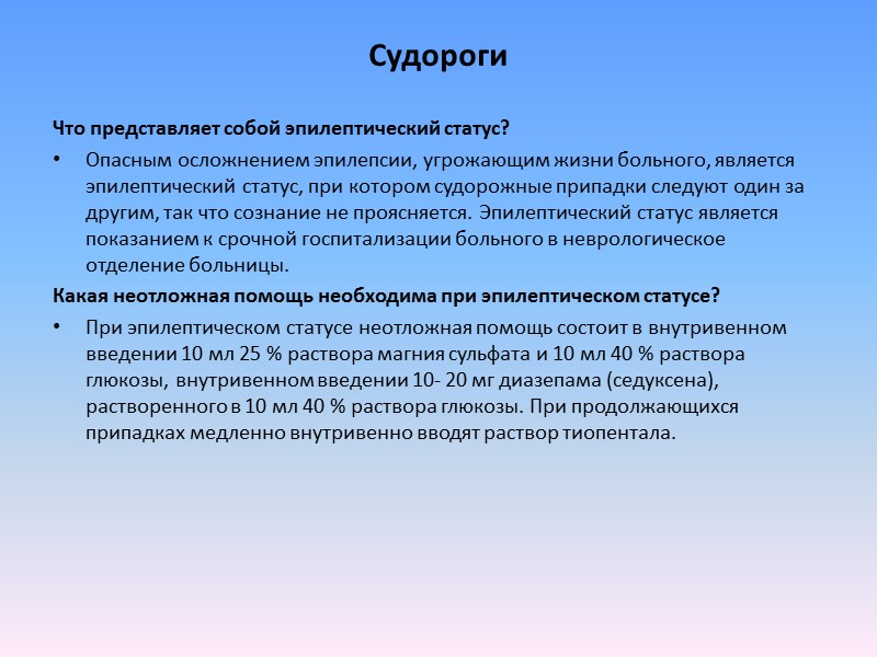 Судороги Что представляет собой эпилептический статус? Опасным осложнением эпилепсии, угрожающим жизни больного, является эпилептический статус, при котором судорожные припадки следуют один за другим, так что сознание не проясняется. Эпилептический статус является показанием к срочной госпитализации больного в неврологическое отделение больницы. Какая неотложная помощь необходима при эпилептическом статусе? При эпилептическом статусе неотложная помощь состоит в внутривенном введении 10 мл 25 % раствора магния сульфата и 10 мл 40 % раствора глюкозы, внутривенном введении 10- 20 мг диазепама (седуксена), растворенного в 10 мл 40 % раствора глюкозы. При продолжающихся припадках медленно внутривенно вводят раствор тиопентала.