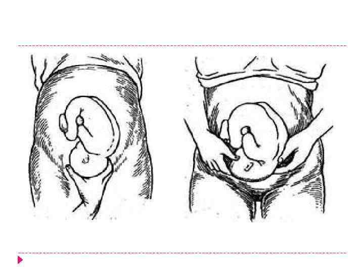 Пальпация живота. Приемы Леопольда. Первый прием -Высота стояния дна матки, положение плода; Второй прием – уточнить положение, позицию и вид плода Третий и четвертый прием – уточнить предлежащую часть, ее положение по отношению к плоскости входа в малый таз.