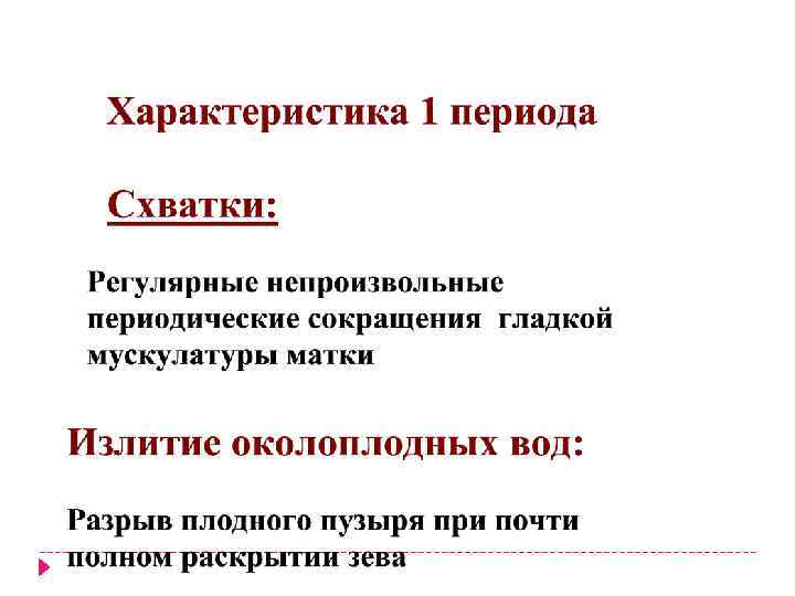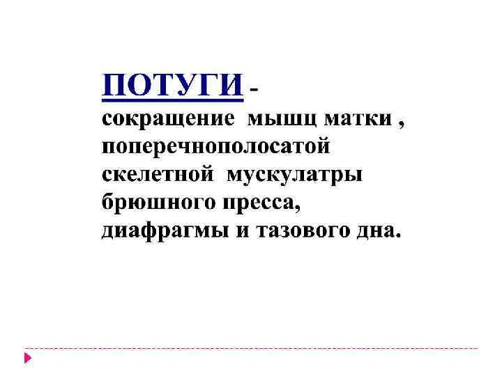 Биомеханизм родов может начинаться в периоде раскрытия, но чаще он осуществляется в периоде изгнания. При переходе головки из широкой части таза в узкую, плод встречает препятствие. Для дальнейшего продвижения плода необходимо дополнителное усилие- потуги.
