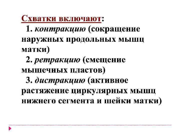 Шкала оценки шейки матки по Бишоп Степень зрелости, балл Признак 0 Раскрытие ШМ, 0 см. 1 2 3 1 -2 3 -4 5 -6 Сглаженность ШМ, % 0 -30 40 -60 60 -70 80 Место нахождения предлежащей части -3 (над входом в малый таз) -2 (прижата ко входу в малый таз) -1 (малым сегментом во входе в малый таз) 0 (большим сегментом во ходе в малый таз) +1 (в широкой части малого таза) +2 (в узкой части малого таза) Консистенция ШМ плотная размягчена мягкая Положение ШМ кзади срединное кпереди