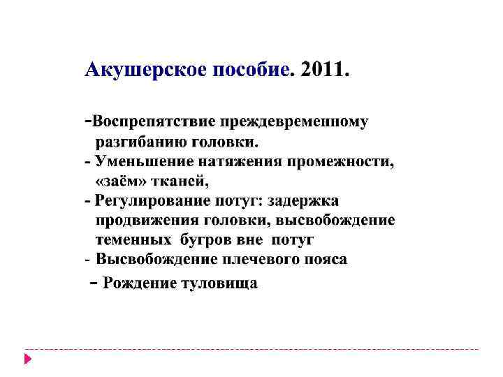 Акушерское пособие в родах. Предупреждение преждевременного разгибания головки плода. Защита промежности (заем тканей). Разгибание головки (вне потуги). Выведение головки, рождение верхнего, затем нижнего плечика. После рождения ребенка убрать из-под спины роженицы подушки.