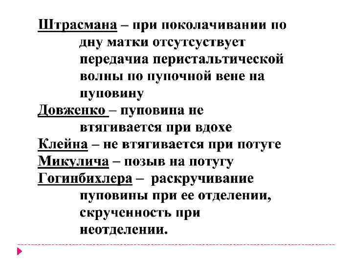 Признаки отделения последа: Признак Кюстнера-Чукалова: при надавливании краем ладони над лобком пуповина, свисающая из половой щели, при неотделившейся плаценте втягивается во влагалище