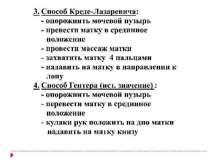 Роговина – тело матки двумя ладонными поверхностями отводится кверху, после чего правой рукой производят выжимание последа путем сжимания матки в переднезаднем направлении и одновременным надавливанием на ее дно по направлению вниз и вперед вдоль оси таза.