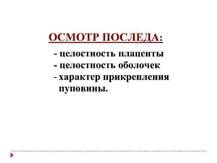 Профилактика кровотечения – окситоцин (метилэргобревин). Вывести мочу катетером. Вышедшее из влагалища детское место (плацента с оболочками и пуповиной) тщательно осматривается: оно раскладывается плашмя материнской поверхностью кверху. Послед обязательно доставить в акушерский стационар Дефект плацентарной ткани- следует тотчас же произвести ручное обследование стенок полости матки и удалить рукой задержавшуюся дольку.