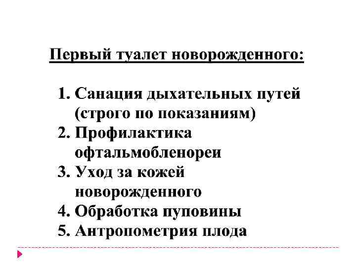 Новорожденный : 1. Необоснованная транспортировка новорожденных в различные помещения акушерского стационара должна быть исключена. Вакцинация, забор крови для неонатального скрининга, аудиологический скрининг, осмотр врача проводятся в той палате, где находится ребенок. 2. Рекомендуется свободное пеленание ребенка с открытыми ручками. 3. Уход за пуповинным остатком осуществляется сухим способом. 4. Хирургическое иссечение пуповинного остатка - потенциально опасная процедура, поэтому она категорически не рекомендуется.