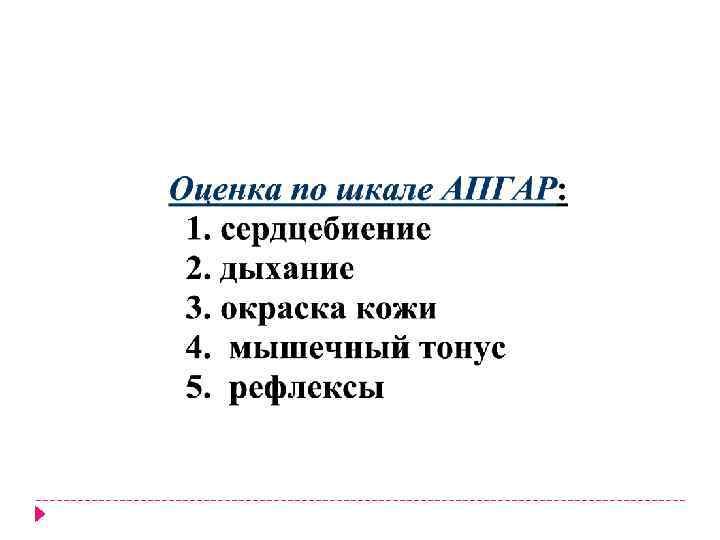 Родившегося младенца кладут между ног матери на стерильные пеленки, накрывают сверху еще одной, чтобы не допустить переохлаждения. Обработка ребенка. Отсосать слизь изо рта и носа. Показать ребенка матери. Закапать в глаза (и половую щель) 30% р-р сульфацила натрия. Новорожденного завернуть в теплые пеленки, согреть. Оценка состояния новорожденного по шкале Апгар (ЧСС, ЧД, мышечный тонус, рефлексы, кожа). Максимальное количество баллов на каждый признак не более 2 баллов. 0 баллов - клиническая смерть; 4 -5 баллов и менее - тяжелая асфиксия (состояние тяжелое); 6 -7 баллов - легкая асфиксия (состояние средней тяжести); 8 -10 баллов - удовлетворительное состояние. При выявлении асфиксии, особенно тяжелой, вызвать на себя детскую реанимационную бригаду, начать проводить реанимационные мероприятия.