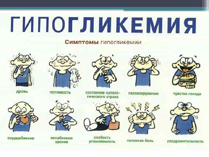 Клиника (продолжение): Б) С-м нейрогликопении – головная боль, головокружение, слабость, нарушение координации движений и дезориентация в окружающей обстановке, неадекватное поведение, транзиторные нарушения зрения и речи, парестезии, спутанность сознания, судороги и кома. По степени тяжести: ▫ Легкая гипогликемия – протекает без потери сознания, не требует посторонней помощи для купирования. ▫ Тяжелая гипогликемия – протекает с потерей сознания либо не может быть купирована больным без посторонней помощи.