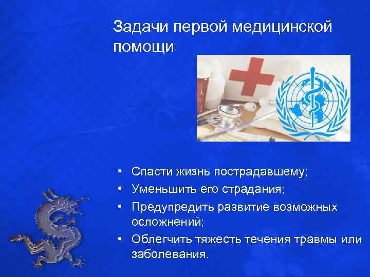 Задачи первой медицинской помощи • Спасти жизнь пострадавшему; • Уменьшить его страдания; • Предупредить развитие возможных осложнений; • Облегчить тяжесть течения травмы или заболевания.