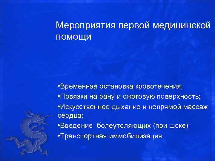 Мероприятия первой медицинской помощи • Временная остановка кровотечения; • Повязки на рану и ожоговую поверхность; • Искусственное дыхание и непрямой массаж сердца; • Введение болеутоляющих (при шоке); • Транспортная иммобилизация.
