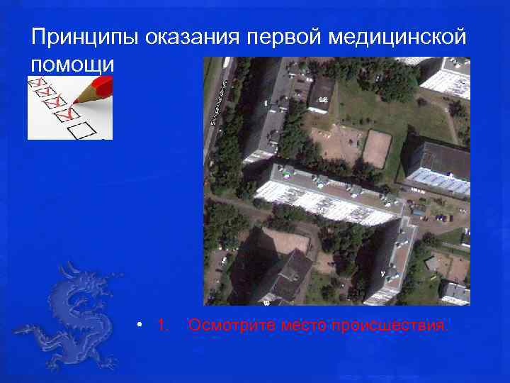 Принципы оказания первой медицинской помощи • 1. Осмотрите место происшествия.
