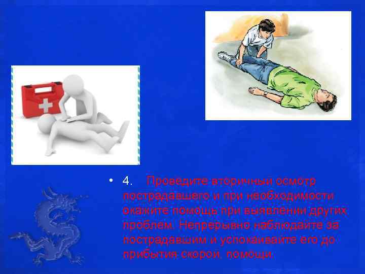 • 4. Проведите вторичный осмотр пострадавшего и при необходимости окажите помощь при выявлении других проблем. Непрерывно наблюдайте за пострадавшим и успокаивайте его до прибытия скорой, помощи.