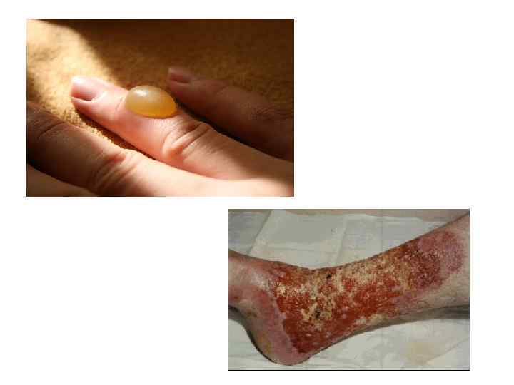 Степени ожогов I II III А III Б IV покраснение и отёчность кожи и слизистой образование пузырей, заполненных светло-жёлтой жидкостью, пузыри небольшие, зона вокруг отёка небольшая большие напряжённые пузыри, стенка которых, как правило, разорвана, дно раны розовое, влажное. Болевая чувствительность на дне пузыря сохранена или снижена. В более поздние сроки может образоваться светло -жёлтый струп, иногда с коричневым и серым оттенком пузырь с явно кровянистым содержимым, стенка его чаще всего разрушена, дно сухое, белесоватое, с отдельными бледными пятнами, иногда с мраморным рисунком. Болевая чувствительность снижена или отсутствует, струп, если он образуется, тёмный или коричневый характерный чёрный или коричневый струп, под которым могут просвечиваться тромбированные вены, поражены подлежащие ткани (мышцы, сухожилия и др. )