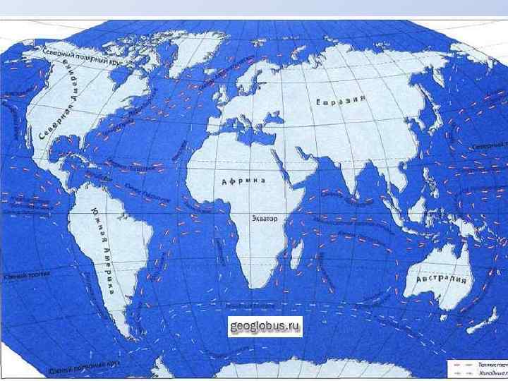 ПРОДОЛЖИМ ТАБЛИЦУ Течение Западных ветров Течение Гольфстрим Лабрадорское течение Проходит в приполярных широтах, соединяет Атлантический, Индийский, Тихий океаны; направление с запада на восток, длина – 30 тыс. км. , ширина – 2500 км. , скорость течения 3, 5 км. в час. Проходит близ берегов Северной Америки, по направлению с югозапада на северо-восток. Длина – 3 тыс. км. , ширина – сотни км. , скорость до 10 км. /час. Проходит из Северного -Ледовитого океана в Атлантический, вдоль восточного берега полуострова Лабрадор.
