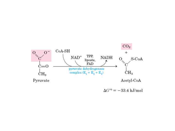 Суммарная реакция Пируват + ++ НАД HS-Ko. A -> ->Ацетил-Ko. A + НАДН + ++ Н CO 2 Реакция сопровождается значительным уменьшением стандартной свободной энергии и практически необратима. Ацетил-Ко. А подвергается дальнейшему окислению в цикле трикарбоновых кислот (цикле Кребса).