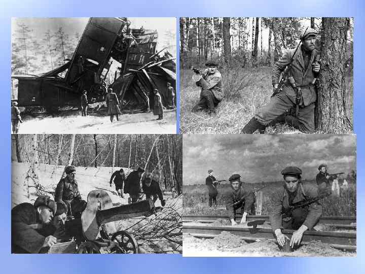 Формы партизанских действий: 1) Засады 2) Внезапные налеты на небольшие гарнизоны, 3) Диверсии на заводах и в мастерских, портили оборудование, выводили из строя паровозы и вагоны, препятствовали угону советских людей в Германию, срывали поставки продовольствия. , 4) «Рельсовая война» и «Концерт» с октября 1942 г. по март 1943 г. партизаны совершили 1, 5 тыс. диверсий на железных дорогах. Для охраны коммуникаций и борьбы с партизанами в разгар боев под Сталинградом и на Кавказе немецкое командование было вынуждено снять 22 дивизии. К осени 1943 г. было выведено из строя более 2 тыс. км железнодорожных путей, множество мостов, водокачек и другого станционного оборудования. 5) Партизаны передавали советскому командованию разведданные о количестве и дислокации немецких войск. Некоторым подпольщикам удавалось завладеть особо секретной немецкой документацией.