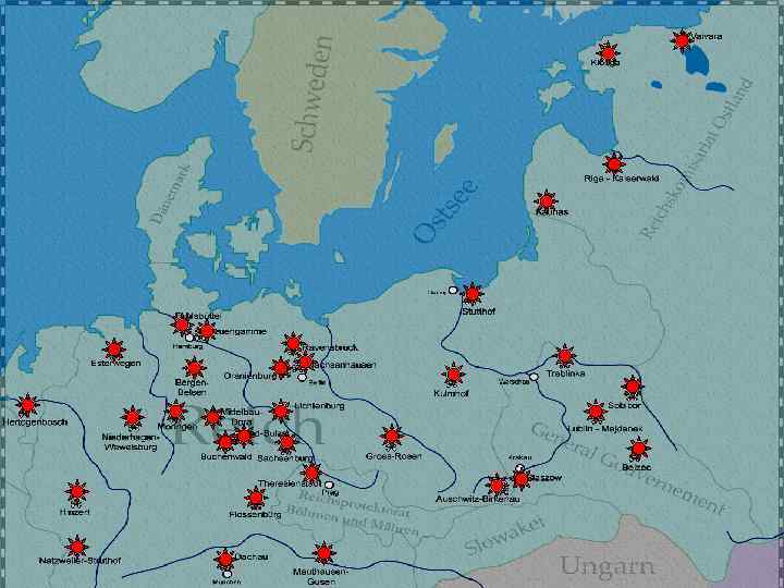 Сеть лагерей 1. 2. 3. 4. 5. 6. 7. 8. 9. 10. 11. 12. 13. 14. 15. 16. 17. 18. 19. 20. 21. 22. Арбайтсдорф (Германия) Аушвиц/Освенцим/ (Польша) Берген-Бельзен (Германия) Бухенвальд (Германия) Варшава (Польша) Герцогенбуш (Нидерланды) Гросс-Розен (Германия) Дахау (Германия) Кауен (Каунас, Литва) Плащов (Краков, Польша) Заксенхаузен (Германия) Майданек (Люблин, Польша) Маутхаузен (Австрия) Миттельбау-Дора (Германия) Натцвайлер (Франция) Нейенгамме (Германия) Нидерхаген-Вевельсбург (Германия) Равенсбрюк (Германия) Рига-Кайзервальд (Латвия) Файфара/Вайвара (Эстония) Флоссенбург (Германия) Штуттхоф (Польша).