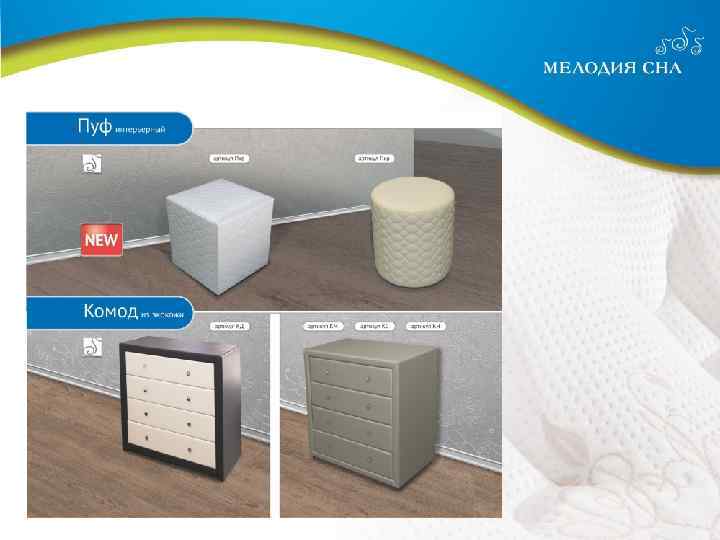 Мебельное производство • Материал корпуса внутренний- ЛДСП 16 мм • Мягкая обивка – пена Orto-Soft • Материал корпуса внешний: • Фактурный ЛДСП 16 мм, 25 мм (Egger, Kronospan) • Обшивка из Эко-кожи класса «Люкс» , микрожаккарда и микровелюра • Декор - пуговицы, стразы, отстрочка
