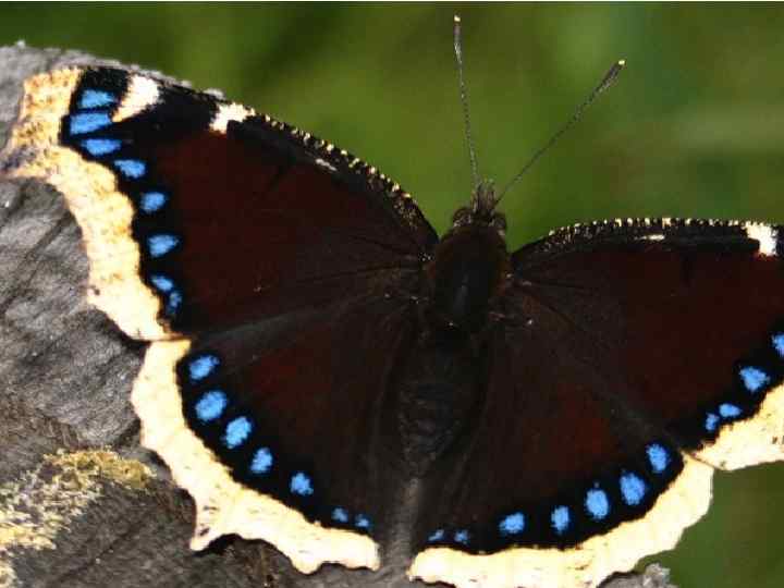 Траурница – дневная бабочка из семейства нимфалид. Крылышки бархатистые, темно – коричневого или вишнево – коричневого цв По краю крыльев проходит светло – желтая полоса, перед которо находится ряд голубых или синих пятнышек. Темненькое платьице, Светлая кайма. День уж начинается, Ночь прошла и тьма.