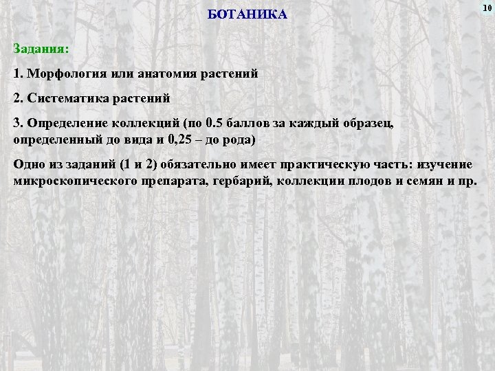БОТАНИКА Задания: 1. Морфология или анатомия растений 2. Систематика растений 3. Определение коллекций (по 0. 5 баллов за каждый образец, определенный до вида и 0, 25 – до рода) Одно из заданий (1 и 2) обязательно имеет практическую часть: изучение микроскопического препарата, гербарий, коллекции плодов и семян и пр. 10