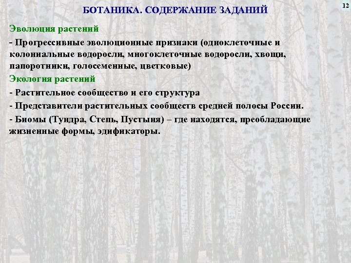 БОТАНИКА. СОДЕРЖАНИЕ ЗАДАНИЙ Эволюция растений - Прогрессивные эволюционные признаки (одноклеточные и колониальные водоросли, многоклеточные водоросли, хвощи, папоротники, голосеменные, цветковые) Экология растений - Растительное сообщество и его структура - Представители растительных сообществ средней полосы России. - Биомы (Тундра, Степь, Пустыня) – где находятся, преобладающие жизненные формы, эдификаторы. 12