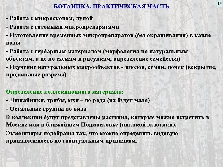 БОТАНИКА. ПРАКТИЧЕСКАЯ ЧАСТЬ - Работа с микроскопом, лупой - Работа с готовыми микропрепаратами - Изготовление временных микропрепаратов (без окрашивания) в капле воды - Работа с гербарным материалом (морфология по натуральным объектам, а не по схемам и рисункам, определение семейства) - Изучение натуральных макрообъектов - плодов, семян, почек (вскрытие, продольные разрезы) Определение коллекционного материала: - Лишайники, грибы, мхи – до рода (их будет мало) - Остальные группы до вида В коллекции будут представлены растения, которые можно встретить в Москве или в ближайшем Подмосковье (никакой экзотики). Экземпляры подобраны так, что можно определить видовую принадлежность по габитуальным признакам. 13