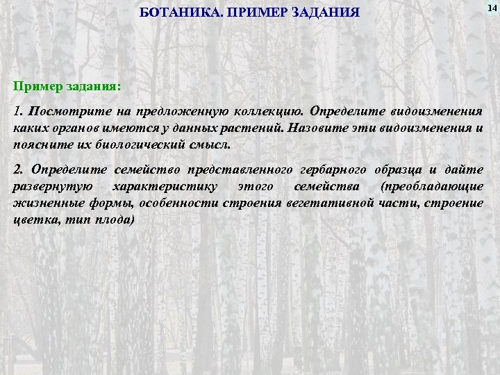 БОТАНИКА. ПРИМЕР ЗАДАНИЯ Пример задания: 1. Посмотрите на предложенную коллекцию. Определите видоизменения каких органов имеются у данных растений. Назовите эти видоизменения и поясните их биологический смысл. 2. Определите семейство представленного гербарного образца и дайте развернутую характеристику этого семейства (преобладающие жизненные формы, особенности строения вегетативной части, строение цветка, тип плода) 14