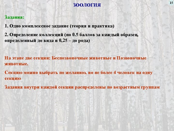 ЗООЛОГИЯ Задания: 1. Одно комплексное задание (теория и практика) 2. Определение коллекций (по 0. 5 баллов за каждый образец, определенный до вида и 0, 25 – до рода) На этапе две секции: Беспозвоночные животные и Позвоночные животные. Секцию можно выбрать по желанию, но не более 4 человек на одну секцию Задания внутри каждой секции распределены по возрастным группам 15