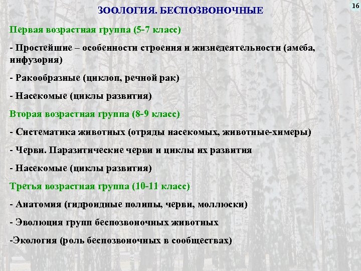 ЗООЛОГИЯ. БЕСПОЗВОНОЧНЫЕ Первая возрастная группа (5 -7 класс) - Простейшие – особенности строения и жизнедеятельности (амеба, инфузория) - Ракообразные (циклоп, речной рак) - Насекомые (циклы развития) Вторая возрастная группа (8 -9 класс) - Систематика животных (отряды насекомых, животные-химеры) - Черви. Паразитические черви и циклы их развития - Насекомые (циклы развития) Третья возрастная группа (10 -11 класс) - Анатомия (гидроидные полипы, черви, моллюски) - Эволюция групп беспозвоночных животных -Экология (роль беспозвоночных в сообществах) 16