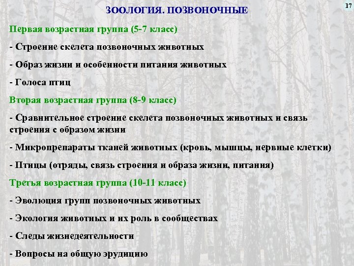 ЗООЛОГИЯ. ПОЗВОНОЧНЫЕ Первая возрастная группа (5 -7 класс) - Строение скелета позвоночных животных - Образ жизни и особенности питания животных - Голоса птиц Вторая возрастная группа (8 -9 класс) - Сравнительное строение скелета позвоночных животных и связь строения с образом жизни - Микропрепараты тканей животных (кровь, мышцы, нервные клетки) - Птицы (отряды, связь строения и образа жизни, питания) Третья возрастная группа (10 -11 класс) - Эволюция групп позвоночных животных - Экология животных и их роль в сообществах - Следы жизнедеятельности - Вопросы на общую эрудицию 17