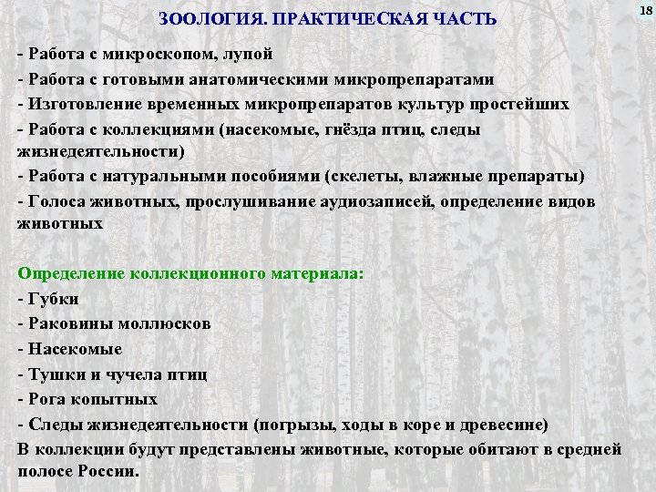 ЗООЛОГИЯ. ПРАКТИЧЕСКАЯ ЧАСТЬ - Работа с микроскопом, лупой - Работа с готовыми анатомическими микропрепаратами - Изготовление временных микропрепаратов культур простейших - Работа с коллекциями (насекомые, гнёзда птиц, следы жизнедеятельности) - Работа с натуральными пособиями (скелеты, влажные препараты) - Голоса животных, прослушивание аудиозаписей, определение видов животных Определение коллекционного материала: - Губки - Раковины моллюсков - Насекомые - Тушки и чучела птиц - Рога копытных - Следы жизнедеятельности (погрызы, ходы в коре и древесине) В коллекции будут представлены животные, которые обитают в средней полосе России. 18