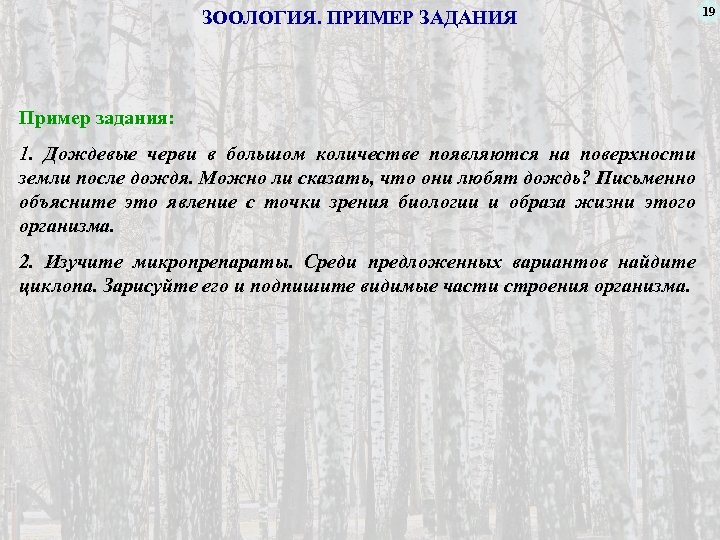 ЗООЛОГИЯ. ПРИМЕР ЗАДАНИЯ Пример задания: 1. Дождевые черви в большом количестве появляются на поверхности земли после дождя. Можно ли сказать, что они любят дождь? Письменно объясните это явление с точки зрения биологии и образа жизни этого организма. 2. Изучите микропрепараты. Среди предложенных вариантов найдите циклопа. Зарисуйте его и подпишите видимые части строения организма. 19