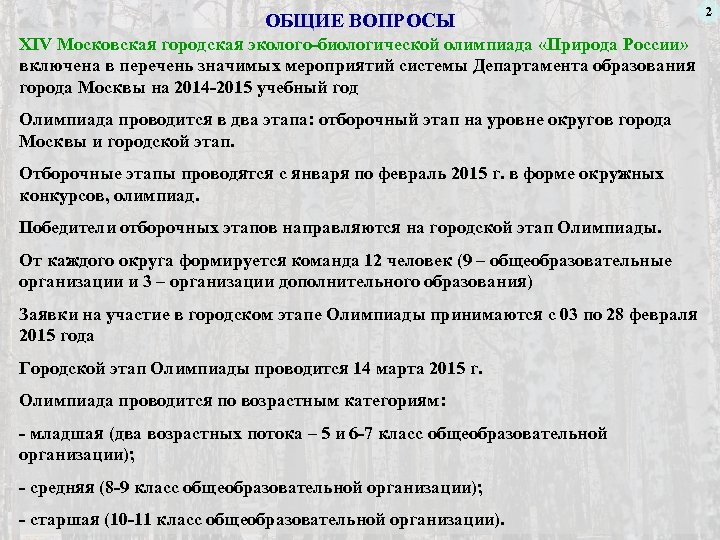 ОБЩИЕ ВОПРОСЫ XIV Московская городская эколого-биологической олимпиада «Природа России» включена в перечень значимых мероприятий системы Департамента образования города Москвы на 2014 -2015 учебный год Олимпиада проводится в два этапа: отборочный этап на уровне округов города Москвы и городской этап. Отборочные этапы проводятся с января по февраль 2015 г. в форме окружных конкурсов, олимпиад. Победители отборочных этапов направляются на городской этап Олимпиады. От каждого округа формируется команда 12 человек (9 – общеобразовательные организации и 3 – организации дополнительного образования) Заявки на участие в городском этапе Олимпиады принимаются с 03 по 28 февраля 2015 года Городской этап Олимпиады проводится 14 марта 2015 г. Олимпиада проводится по возрастным категориям: - младшая (два возрастных потока – 5 и 6 -7 класс общеобразовательной организации); - средняя (8 -9 класс общеобразовательной организации); - старшая (10 -11 класс общеобразовательной организации). 2