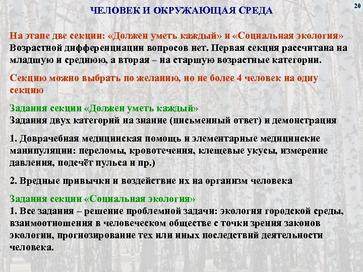 ЧЕЛОВЕК И ОКРУЖАЮЩАЯ СРЕДА На этапе две секции: «Должен уметь каждый» и «Социальная экология» Возрастной дифференциации вопросов нет. Первая секция рассчитана на младшую и среднюю, а вторая – на старшую возрастные категории. Секцию можно выбрать по желанию, но не более 4 человек на одну секцию Задания секции «Должен уметь каждый» Задания двух категорий на знание (письменный ответ) и демонстрация 1. Доврачебная медицинская помощь и элементарные медицинские манипуляции: переломы, кровотечения, клещевые укусы, измерение давления, подсчёт пульса и пр. ) 2. Вредные привычки и воздействие их на организм человека Задания секции «Социальная экология» 1. Все задания – решение проблемной задачи: экология городской среды, взаимоотношения в человеческом обществе с точки зрения законов экологии, прогнозирование тех или иных последствий деятельности человека. 20
