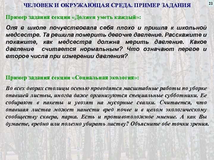 ЧЕЛОВЕК И ОКРУЖАЮЩАЯ СРЕДА. ПРИМЕР ЗАДАНИЯ 21 Пример задания секции «Должен уметь каждый» : Оля в школе почувствовала себя плохо и пришла к школьной медсестре. Та решила померить девочке давление. Расскажите и покажите, как медсестра должна мерить давление. Какое давление считается нормальным? Что означают первое и второе числа при измерении давления? Пример задания секции «Социальная экология» : Во всех дворах столицы осенью проводятся масштабные работы по уборке опавшей листвы, иногда даже организуются специальные субботники. Ее собирают в пакеты и увозят на мусорные свалки. Считается, что опавшая листва может нанести вред почве и в целом экологическому сообществу сквера, парка. Есть и противоположное мнение. А как Вы думаете, вредно или полезно убирать листву? Объясните обе точки зрения.