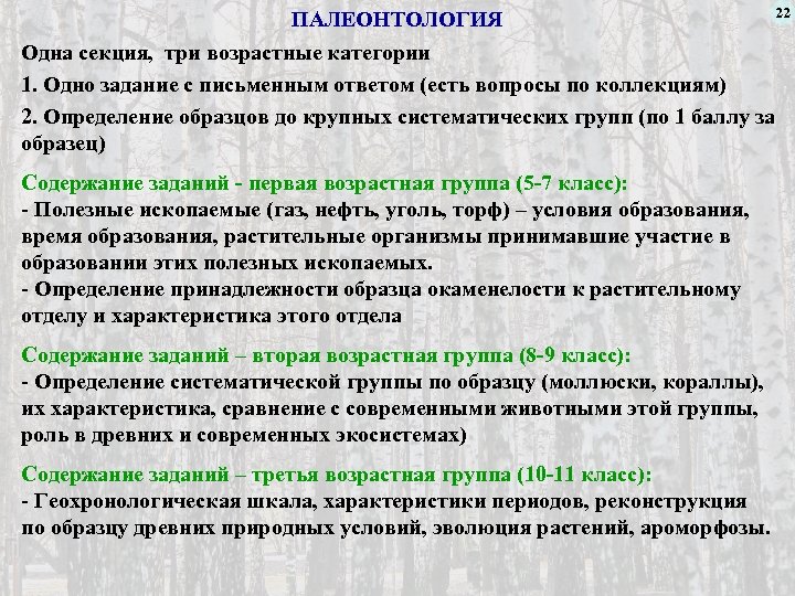 ПАЛЕОНТОЛОГИЯ Одна секция, три возрастные категории 1. Одно задание с письменным ответом (есть вопросы по коллекциям) 2. Определение образцов до крупных систематических групп (по 1 баллу за образец) Содержание заданий - первая возрастная группа (5 -7 класс): - Полезные ископаемые (газ, нефть, уголь, торф) – условия образования, время образования, растительные организмы принимавшие участие в образовании этих полезных ископаемых. - Определение принадлежности образца окаменелости к растительному отделу и характеристика этого отдела Содержание заданий – вторая возрастная группа (8 -9 класс): - Определение систематической группы по образцу (моллюски, кораллы), их характеристика, сравнение с современными животными этой группы, роль в древних и современных экосистемах) Содержание заданий – третья возрастная группа (10 -11 класс): - Геохронологическая шкала, характеристики периодов, реконструкция по образцу древних природных условий, эволюция растений, ароморфозы. 22