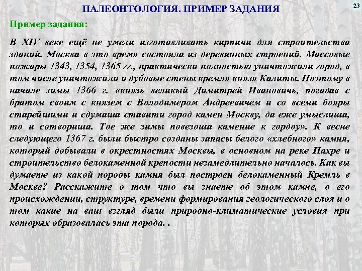ПАЛЕОНТОЛОГИЯ. ПРИМЕР ЗАДАНИЯ Пример задания: В XIV веке ещё не умели изготавливать кирпичи для строительства зданий. Москва в это время состояла из деревянных строений. Массовые пожары 1343, 1354, 1365 гг. , практически полностью уничтожили город, в том числе уничтожили и дубовые стены кремля князя Калиты. Поэтому в начале зимы 1366 г. «князь великый Димитрей Ивановичь, погадав с братом своим с князем с Володимером Андреевичем и со всеми бояры старейшими и сдумаша ставити город камен Москву, да еже умыслиша, то и сотвориша. Toe же зимы повезоша камение к гордоу» . К весне следующего 1367 г. были быстро созданы запасы белого «хлебного» камня, который добывали в окрестностях Москвы, в основном на реке Пахре и строительство белокаменной крепости незамедлительно началось. Как вы думаете из какой породы камня был построен белокаменный Кремль в Москве? Расскажите о том что вы знаете об этом камне, о его происхождении, структуре, времени формирования геологического слоя и о том какие на ваш взгляд были природно-климатические условия при которых образовалась эта порода. . 23