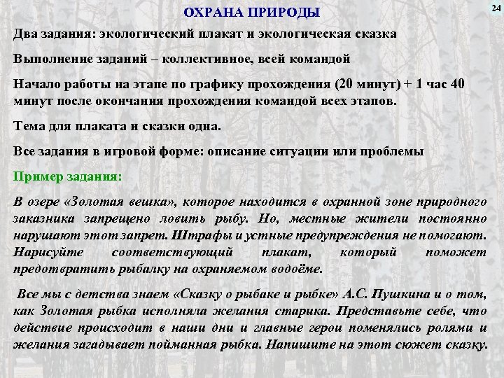 ОХРАНА ПРИРОДЫ Два задания: экологический плакат и экологическая сказка Выполнение заданий – коллективное, всей командой Начало работы на этапе по графику прохождения (20 минут) + 1 час 40 минут после окончания прохождения командой всех этапов. Тема для плаката и сказки одна. Все задания в игровой форме: описание ситуации или проблемы Пример задания: В озере «Золотая вешка» , которое находится в охранной зоне природного заказника запрещено ловить рыбу. Но, местные жители постоянно нарушают этот запрет. Штрафы и устные предупреждения не помогают. Нарисуйте соответствующий плакат, который поможет предотвратить рыбалку на охраняемом водоёме. Все мы с детства знаем «Сказку о рыбаке и рыбке» А. С. Пушкина и о том, как Золотая рыбка исполняла желания старика. Представьте себе, что действие происходит в наши дни и главные герои поменялись ролями и желания загадывает пойманная рыбка. Напишите на этот сюжет сказку. 24