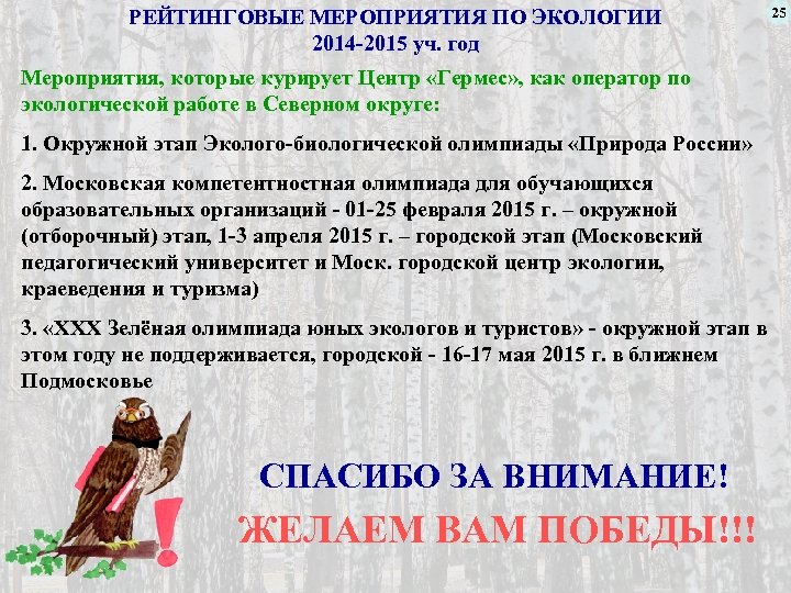 РЕЙТИНГОВЫЕ МЕРОПРИЯТИЯ ПО ЭКОЛОГИИ 2014 -2015 уч. год Мероприятия, которые курирует Центр «Гермес» , как оператор по экологической работе в Северном округе: 1. Окружной этап Эколого-биологической олимпиады «Природа России» 2. Московская компетентностная олимпиада для обучающихся образовательных организаций - 01 -25 февраля 2015 г. – окружной (отборочный) этап, 1 -3 апреля 2015 г. – городской этап (Московский педагогический университет и Моск. городской центр экологии, краеведения и туризма) 3. «XXX Зелёная олимпиада юных экологов и туристов» - окружной этап в этом году не поддерживается, городской - 16 -17 мая 2015 г. в ближнем Подмосковье СПАСИБО ЗА ВНИМАНИЕ! ЖЕЛАЕМ ВАМ ПОБЕДЫ!!! 25