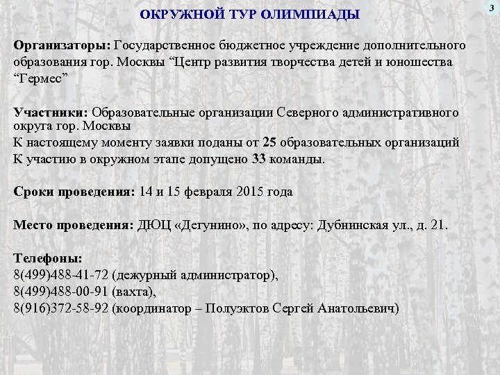 ОКРУЖНОЙ ТУР ОЛИМПИАДЫ Организаторы: Государственное бюджетное учреждение дополнительного образования гор. Москвы “Центр развития творчества детей и юношества “Гермес” Участники: Образовательные организации Северного административного округа гор. Москвы К настоящему моменту заявки поданы от 25 образовательных организаций К участию в окружном этапе допущено 33 команды. Сроки проведения: 14 и 15 февраля 2015 года Место проведения: ДЮЦ «Дегунино» , по адресу: Дубнинская ул. , д. 21. Телефоны: 8(499)488 -41 -72 (дежурный администратор), 8(499)488 -00 -91 (вахта), 8(916)372 -58 -92 (координатор – Полуэктов Сергей Анатольевич) 3