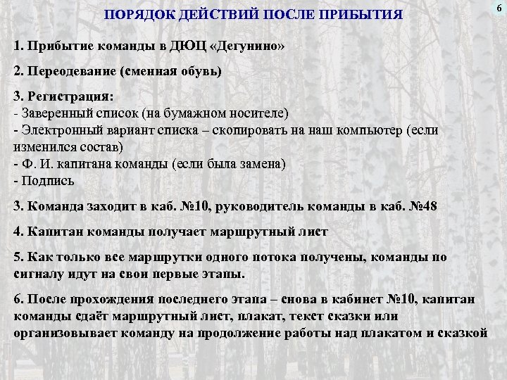 ПОРЯДОК ДЕЙСТВИЙ ПОСЛЕ ПРИБЫТИЯ 1. Прибытие команды в ДЮЦ «Дегунино» 2. Переодевание (сменная обувь) 3. Регистрация: - Заверенный список (на бумажном носителе) - Электронный вариант списка – скопировать на наш компьютер (если изменился состав) - Ф. И. капитана команды (если была замена) - Подпись 3. Команда заходит в каб. № 10, руководитель команды в каб. № 48 4. Капитан команды получает маршрутный лист 5. Как только все маршрутки одного потока получены, команды по сигналу идут на свои первые этапы. 6. После прохождения последнего этапа – снова в кабинет № 10, капитан команды сдаёт маршрутный лист, плакат, текст сказки или организовывает команду на продолжение работы над плакатом и сказкой 6