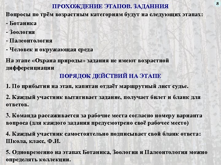 ПРОХОЖДЕНИЕ ЭТАПОВ. ЗАДАННИЯ Вопросы по трём возрастным категориям будут на следующих этапах: - Ботаника - Зоология - Палеонтология - Человек и окружающая среда На этапе «Охрана природы» задания не имеют возрастной дифференциации ПОРЯДОК ДЕЙСТВИЙ НА ЭТАПЕ 1. По прибытии на этап, капитан отдаёт маршрутный лист судье. 2. Каждый участник вытягивает задание, получает билет и бланк для ответов. 3. Команда рассаживается за рабочие места согласно номеру варианта вопроса (для каждого задания предусмотрено своё рабочее место) 4. Каждый участник самостоятельно подписывает свой бланк ответа: Школа, класс, Ф. И. 5. Одновременно на этапах Ботаника, Зоология и Палеонтология можно определять коллекции. 8