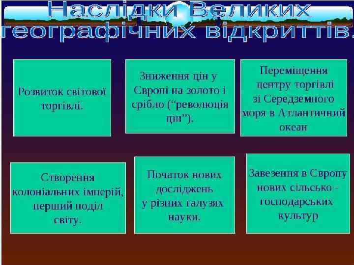• 1497 – 1498 рр. Подорож Васко да Гама – заверщилося відкриттям морського шляху від Західної Європи до Індії, • 1492 Перша подорож Колумба до Америки – завершилася відкриттям Америки. • 1519 – 1521 рр. Кругосвітнє плавання Магеллана – призвело до об'єднання всіх континентальних і локальних ринків в єдину систему господарських і торговельних зв'язків.