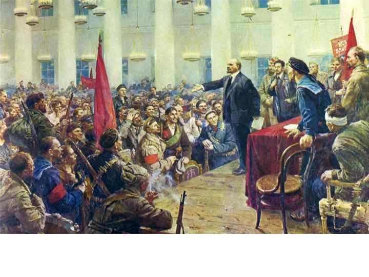 Цели и лозунги октябрьской революции 1917 года • Построение более справедливого общества, нежели капиталистическое • Искоренение эксплуатации человека человеком • Равенство людей в правах и обязанностях. • Главный девиз социалистической революции 1917 года «Каждому по потребностям, от каждого по труду» • Борьба против войн • Мировая социалистическая революция Лозунги революции • «Власть — Советам» • «Мир — народам» • «Земля — крестьянам» • «Фабрики — рабочим»