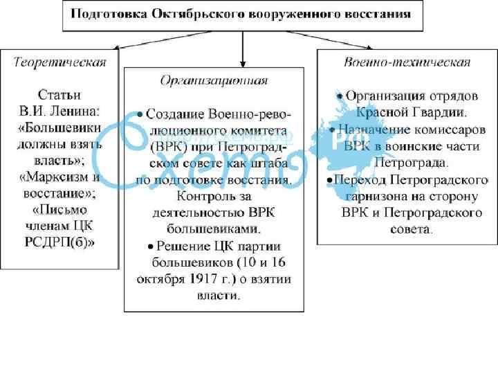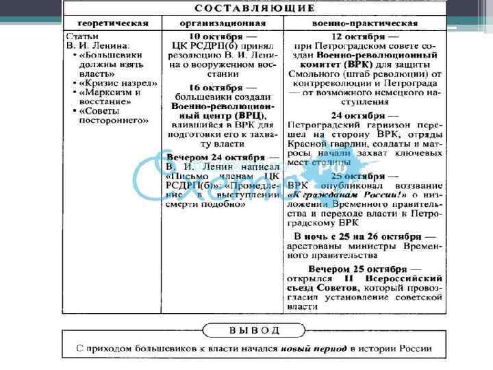 • В деревне нарастали революционные настроения. Не дожидаясь созыва УС крестьяне практически начали аграрную революцию. • В армии под давлением солдат и матросов началась чистка офицерского состава. • Мощным было движение народов за независимость. • Ленин характеризовал это как «общенациональный кризис» • 15 сентября ЦК партии отверг ленинский курс на вооруженное восстание, считая его несвоевременным. • Большинство членов ЦИК высказалось за уничтожение ленинских писем, чтобы предотвратить выступление масс. • В начале октября Ленин нелегально вернулся в Петроград. • 10 октября ЦК РСДРП(б) под его сильным нажимом принял решение о подготовке вооруженного восстания с целью свержения Временного правительства. • 16 октября идея вооруженного восстания окончательно победила.