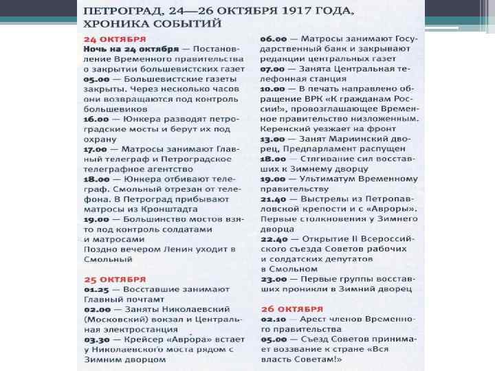 Начало действий. • В отличие от ситуации в феврале 1917 г. Все политические силы знали о готовящемся вооруженном восстании. • 18 октября в газете «Новая жизнь» Л. Б. Каменев от себя и от имени Г. Е. Зиновьева открыто выступил против решения ЦК. • Под предлогом защиты столицы от наступавшей германской армии с подачи большевиков Петроградский Совет 16 октября создал Военно-революционный комитет, ставший легальным органом по подготовке вооруженного восстания. • ВРК направил своих комиссаров в воинские части, на заводы, железные дороги, вооружил отряды рабочей Красной гвардии, которые начали планомерно захватывать ключевые объекты в Петрограде. • Принятая 24 октября Предпарламентом резолюция, призывавшая Временное правительство немедленно издать декрет о передаче земли в ведение земельных комитетов, начать мирные переговоры, была отвергнута Керенским.