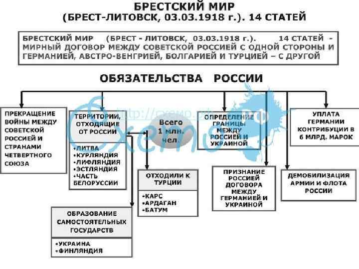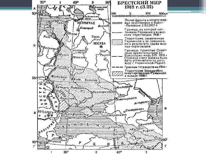 • Война с большевиками стала принимать затяжной характер, что вынуждает Берлин пойти на возобновление переговоров. • 3 марта 1918 был подписан Брестский договор с Германией. Германия получила освобождение от российских войск всей Прибалтики, Украины, Финляндии, демобилизации армии и флота. К Турции отходила территория с городами Карс, Ардаган, Батум. Признавалась гос независимость Украины, Финляндии. Советская сторона обязалась выплатить контрибуцию в 6 млрд марок. • ДОГОВОР УСТАНОВИЛ ЧЕТКИЙ ПРИОРИТЕТ ВНУТРИПОЛИТИЧЕСКИХ ЦЕЛЕЙ НАД ВНЕШНЕПОЛИТИЧЕСКИМИ: ВЫЖИВАНИЮ СОВЕТСКОГО ГОСУДАРСТВО ОТДАВАЛАСЬ ПРЕДПОЧТЕНИЕ ПЕРЕД ЭКСПОРТОМ РЕВОЛЮЦИИ ЗА РУБЕЖ.