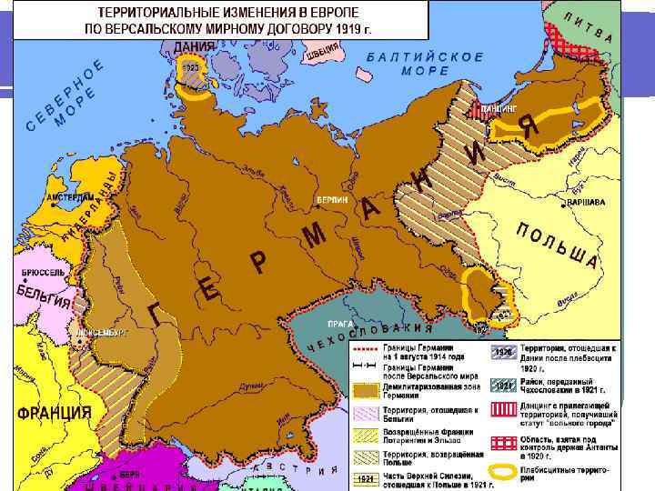 Условия Версальского мирного договора Германия вернула Франции Эльзас и Лотарингию; l Была воссоздана Польша (В. Молотов назвал ее «уродливым детищем Версальского договора» ); l Дания и Бельгия получили приращение территории за счет Германии; l в целом, Германия теряла 1/8 часть территории и 1/10 часть населения; l Кроме того, бывшие колонии Германской империи (Того, Юго-Западная Африка, Восточная Африка, Камерун) передавались Англии и Франции, а германские острова на Тихом океане – Англии и Японии. l Союзники оккупировали Рур – наиболее экономически развитую часть Германии. l