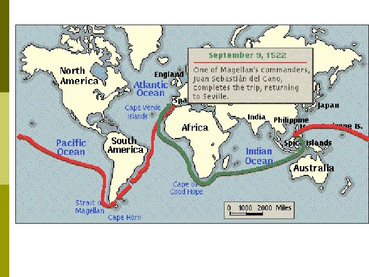 Magellan’s Travels p FERDINAND SAILED FOR SPAIN TO SHOW THAT THE SPICE ISLANDS BELONGED TO SPAIN AND NOT TO PORTUGAL. p 260 MEN AND 5 SHIPS SET OUT ON THE VOYAGE BUT ONLY 18 MEN AND ONE SHIP SURVIVED THE VOYAGE. p MAGELLAN DIED ON APRIL 21, 1521 IN THE PHILIPPINE ISLANDS BY ANGERING THE NATIVES BY CONVERT THEM TO CHRISTIANITY.