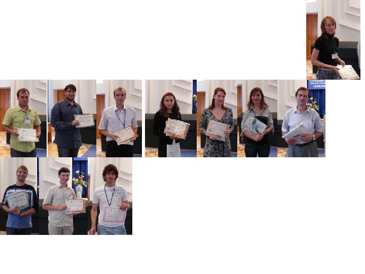 ЛАУРЕАТЫ КОНКУРСА МОЛОДЫХ УЧЕНЫХ 1 место Попов Д. В. 2 место (БИП СО РАН, Улан-Удэ) Полуштайцев Ю. В. (ИМХ РАН, Нижний Новгород) Пыряев А. Н. (ИПХФ РАН, Черноголовка) 3 место Гоношилов Д. Г. (ВПИ, Волжский) Кулагина Г. С. Сидоренко Н. В. Курочкин С. А. (ИПХФ РАН, Черноголовка) (Волг. ГТУ, Волгоград) (ИПХФ РАН, Черноголовка)