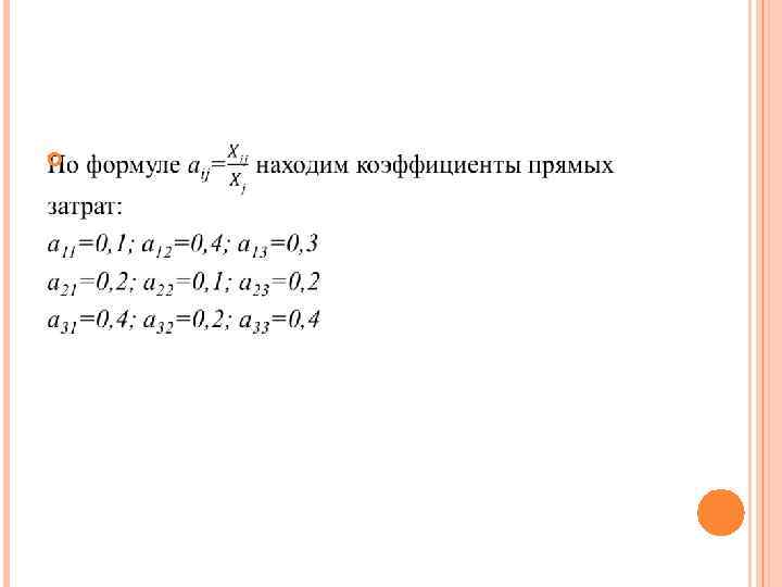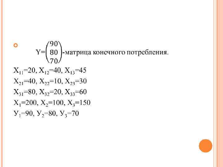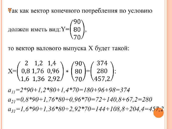 ЗАДАЧА Таблица содержит данные баланса трех отраслей железнодорожной промышленности за некоторый период времени в усл. ден. ед. Потребление Груз. перевозки Вагоностро ение Пасс. перевозки Конечное потреблени е Груз. перевозки 20 40 45 80 200 Вагоностроен ие 40 10 30 70 100 Пасс. перевозки 80 20 60 50 150 Отрасли Валово й выпуск Требуется найти объем валового выпуска продукции, если конечное потребление по отраслям увеличить: для грузовых перевозок до 90, для вагоностроения до 80, а для пассажирских перевозок до 70 усл. ден. ед.